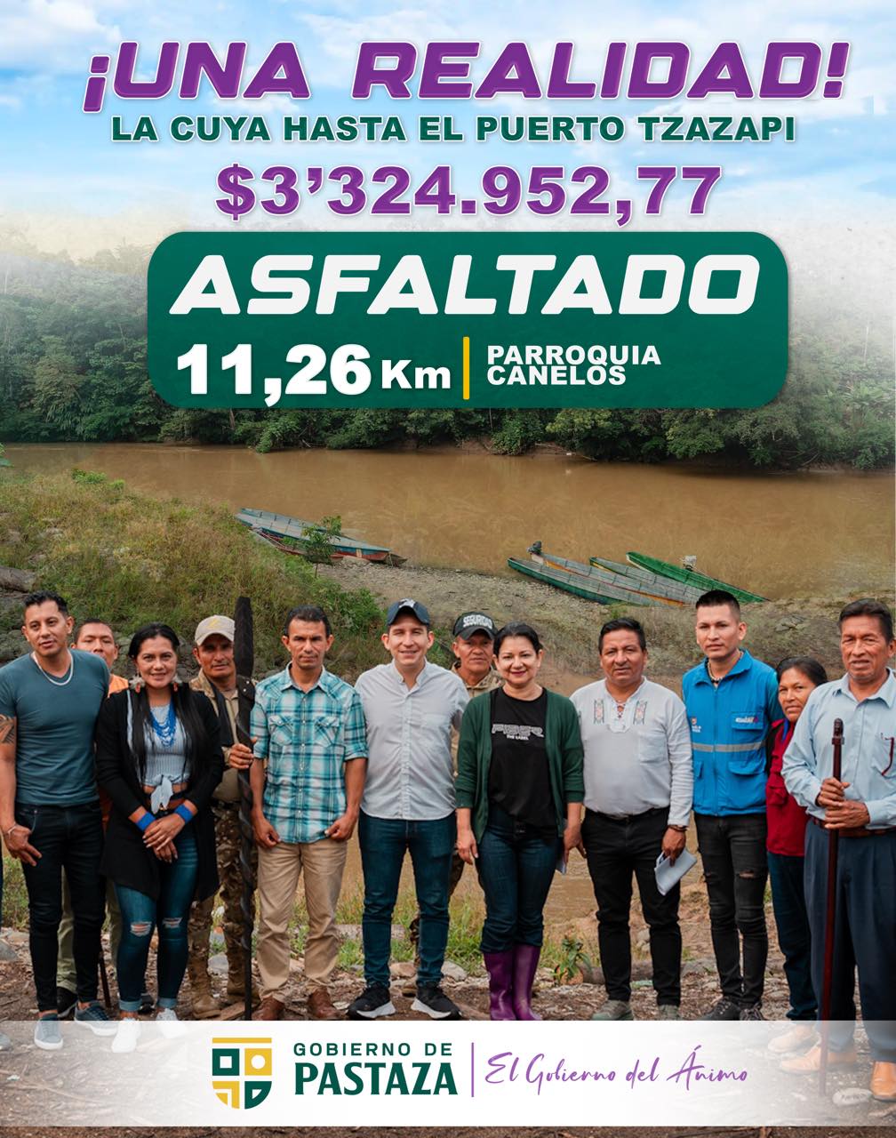 Gracias al apoyo del Gobierno Nacional, a la SCTEA y a la gestión del Prefecto André Granda el proyecto vial de asfalto de 11,26 kilómetros para la vía La Cuya-Puerto Tzazapi en la parroquia Canelos será una realidad este 2024.