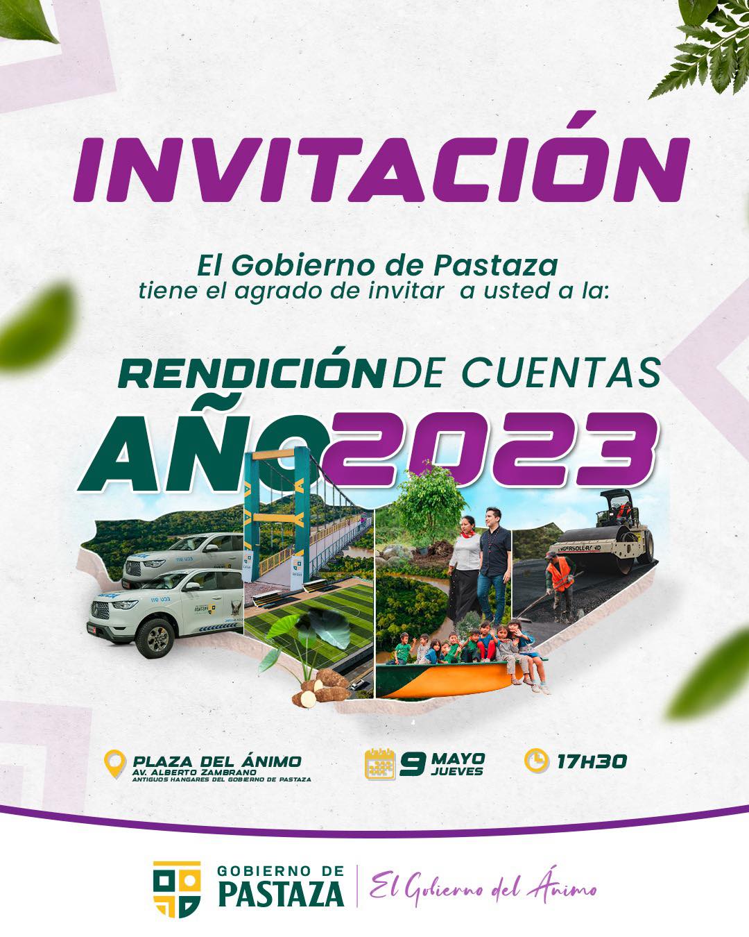 El Gobierno de Pastaza invita al acto público de Rendición de Cuentas este 9 de mayo a las 17H30 en la Plaza del Ánimo.