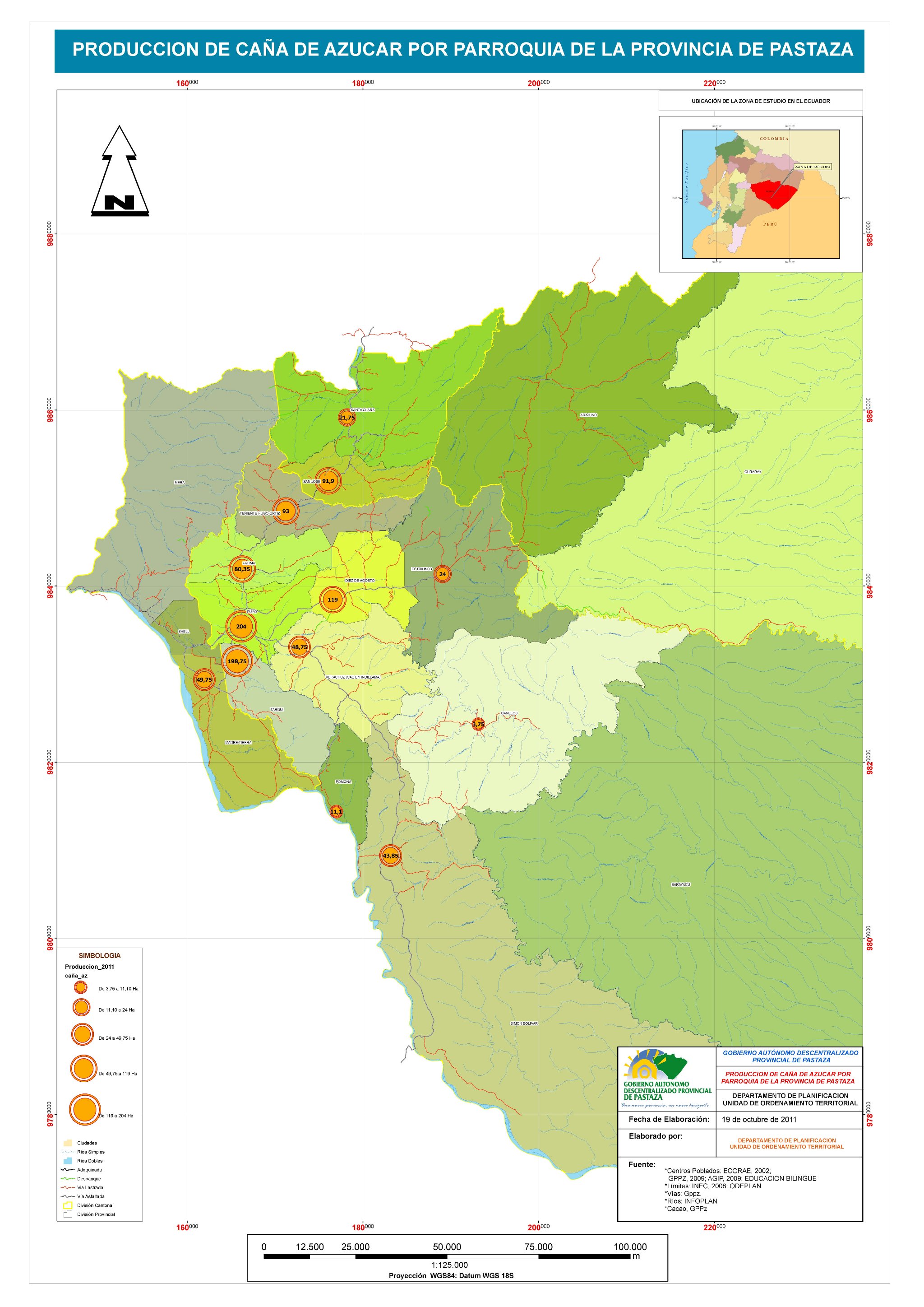 Mapa de Producción de Caña de Azúcar por Parroquia de la Provincia de Pastaza